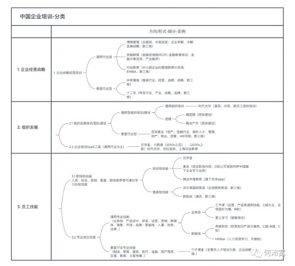 垂直行业型,有在新三板挂牌的中研瀚海、十二年,它们分别面向服装行业、珠宝行业。从垂直行业切入,为行业的企业提供战略经营层的培训,是否在其他行业还有机会,这是其中一个值得继续关注的(比如中国居民消费GDP7%花在衣着服装,它推动的是服装行业对应市场体量的生成。而其他的国民消费行业比如制造业、零售业、建筑业、房地产、金融业、教育业会否有一个垂直项目的可能)。