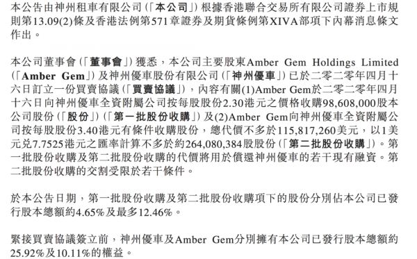 该公告显示,神州优车主要股东Amber Gem及神州优车已于2020年4月16日订立一份买卖协议。内容包括,Amber Gem 2020年4月16日向神州优车全资附属公司按每股股份2.30港元之价格收购9860万股公司股份(下称第一批股份收购)。以此计算,该交易总额为2.27亿港元(约合2.1亿元)。