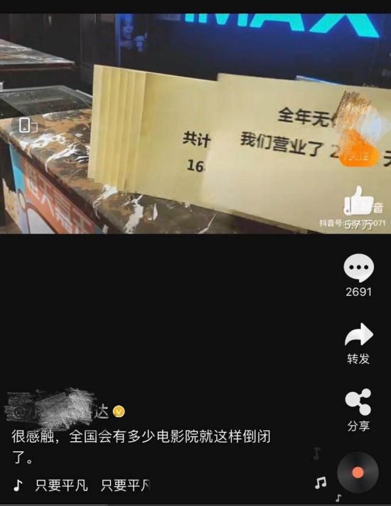 抖音上,某家即将关停的电影院在视频里展示着:“我们全年无休营业了2752天,共计放映了164847场电影,接待过4134602名顾客......2020年4月17日永久闭店。”