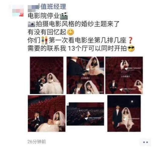 迟迟开不了门的电影院,在开始送外卖、卖冰淇淋、爆米花的自救副业之外,又被逼到出租场地拍婚纱照了。