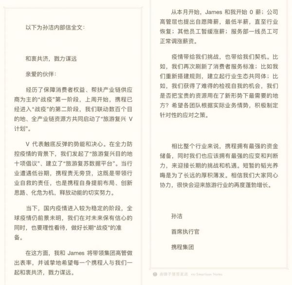 对于旅游行业遭受的创伤,梁建章开诚布公毫不掩饰,在一季度财报电话会议中,携程CFO王肖璠也提到,携程预估一季度最高亏损18.5亿。3月5日,携程发布旅游复兴V计划,四天后,携程CEO孙洁发布全员内部邮件,宣布今年自己与(James)梁建章从本月起开始0薪。