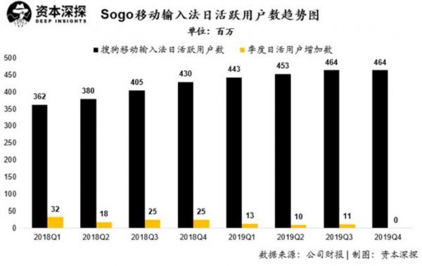 搜狗旗下搜狗输入法活跃用户数在2019年也增长见顶。四季度,搜狗输入法平均日活跃用户数为4.64亿,相比上个季度无增长;而搜狗输入法的平均日活水平,在过去两年增速呈现持续下降趋势。