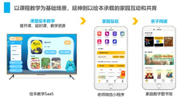 一方面,产品通过SaaS绘本课程新品类,帮助幼儿园降低约80%的教材采购成本。另一方面,园内绘本课程可以自然延伸到亲子阅读的家庭教育场景,通过课后作业和孩子个性化成长数据,向家长智能推荐数字绘本和其他相关教育内容如延时课等,帮助幼儿园增加收入。