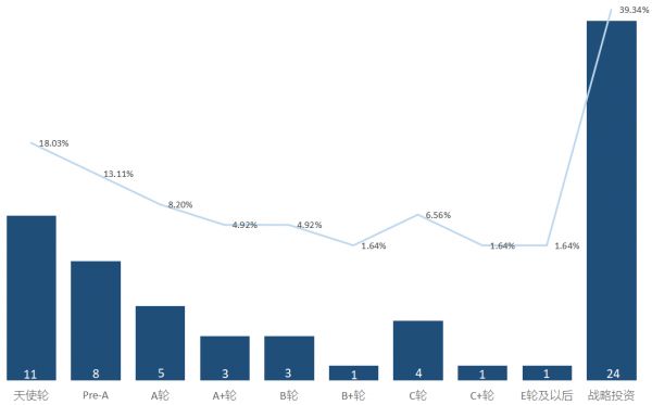 从融资轮次看,项目集中在战略投资和初创项目,其中战略投资24笔、天使轮11笔,分布与上周相比更加高度集中于战略投资。