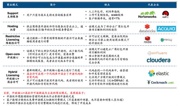 陈昱:关于开源项目的商业模式,其实大家都有所总结,大概分为5种模式:Support(支持服务)、Hosting(托管)、Restrictive Licensing(限制性许可)、Open-core(开放核心)以及Hybrid Licensing(开放核心+混合许可),各自也有其代表性的企业。目前开放核心+混合许可证正逐渐成为主流的商业模式。
