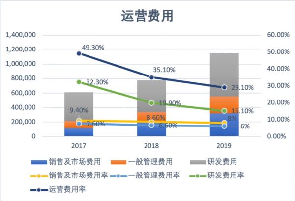 金山云的运营费用率也在不断降低,2017年~2019年间,运营费用率从49.30%、35.10%降低至29.10%,这主要归功于研发费用的不断降低。研发费用在整体运营费用中一直占大头,研发费用率2017年~2019年间分别为21.30%、19.90%和15.10%。