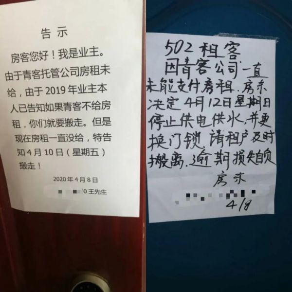 4月8号,李力亮下班回家的时候发现房东在门口贴了通知单:2019年业主本人已告知青客如果不给房租,你们就要搬走。但现在青客托管公司房租一直未给,特告知4月10日搬!