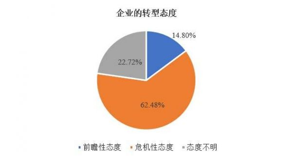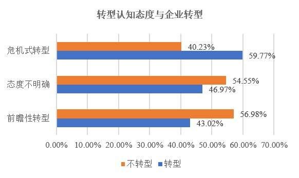 2. 在具有前瞻性转型认知的企业中,此次疫情后真正进行转型的企业比例较低,而持危机性转型态度的企业实际采取了战略转型的比例反而更高。