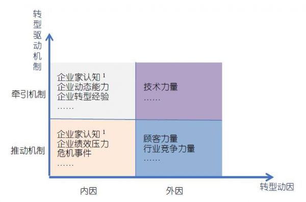 事实上,各种动因对企业转型的驱动机制也是有所差异的,主要包括牵引机制与推动机制。其中牵引机制主要是指促使企业主动进行战略转型的作用机理,比如企业基于自身的战略愿景与使命,提前规划好自己的战略节奏,即使没有来自外部环境突发事件的冲击和竞争对手的市场压力,也会通过内部“战略实验”等方式进行主动转型。