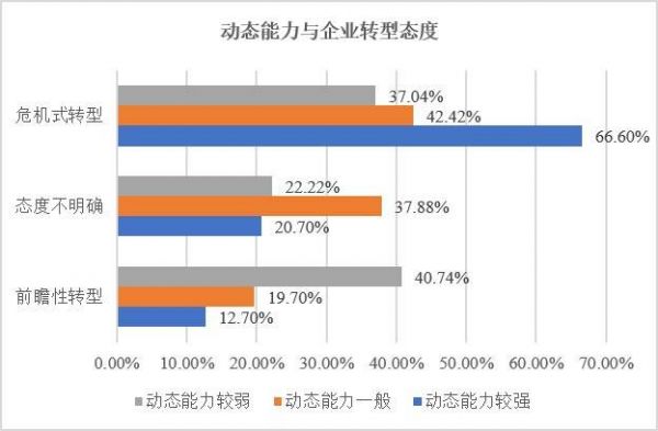 此外,调查还发现(图5),在动态能力较强的企业中,高达66.6%的企业所进行的转型都是危机性的,而仅有12.7%的企业所进行的转型是前瞻性的。与此相对,在动态能力较弱的企业中,前瞻性转型却高达40.74%,甚至于还高于危机式转型的37.04%,表明企业的动态能力越强,其进行的战略转型越可能是危机性转型,相反动态越弱的企业,其转型反而更有可能是前瞻性转型。