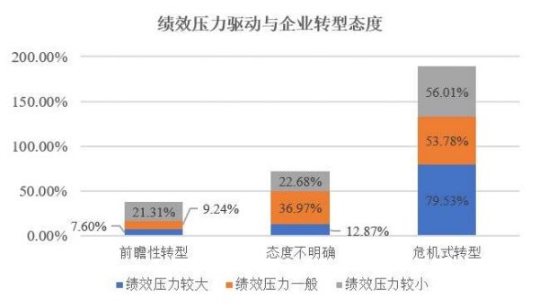 进一步,调查还发现(如图10所示),绩效压力较大与绩效压力较小的企业进行前瞻性转型的比例分别为7.6%和21.31%,进行危机性转型的比例则分别为79.53%和56.01%,二者差异较大。这一现象比较有趣,没有过多业绩压力的企业中具有前瞻性转型认知态度的比重远高于业绩压力较大的企业,而持危机性转型认知的比重却远低于业绩压力大的企业。