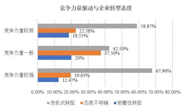 是否受到较强竞争力量驱动的企业更倾向于前瞻性转型呢?调查结果显示(如图13),竞争力量驱动较强的企业进行前瞻性转型的占比略低于竞争力量驱动较弱的企业,而危机性转型的占比(67.9%)则略高于竞争力量驱动较弱的企业(58.87%)。
