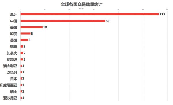 交易数量:该7日交易数据显示:全球新增113起交易事件,中国交易数量占全球交易数量的61.06%;美国交易数量占全球总交易数量的15.93%。