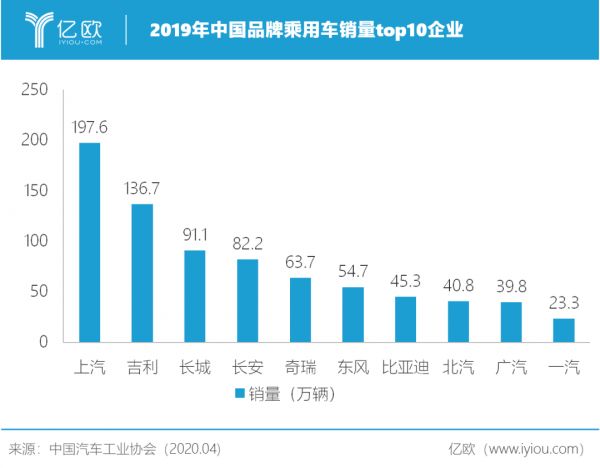 近年来,中国品牌销量进入“百万量级俱乐部”的有:上汽、一汽、北汽、东风、广汽、长安、吉利、长城,就2019年中国品牌乘用车销量排名前十的车企来看,上汽、吉利、长城保持领先优势。
