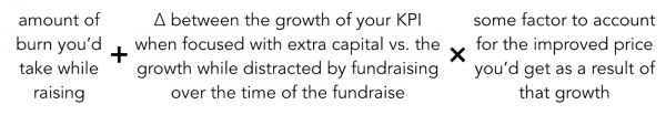 融资期间要烧掉的钱+(有额外资金时专心发展KPI所得结果—融资期间被融资的事情分心所得到的结果)x 更好的增长系数
