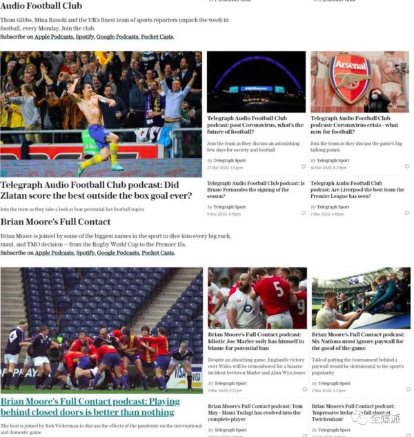The Telegraph积极打造的播客栏目矩阵目前有三个版块。第一个版块的栏目是周刊节目,包含有Chopper’s Politics(由Christopher Hope打造的时政访谈栏目,每周五播出)、Audio Football Club(足球赛事播报),以及Brian Moore’s Full Contact(橄榄球赛事播报),这几款播客节目都以周为单位播出。