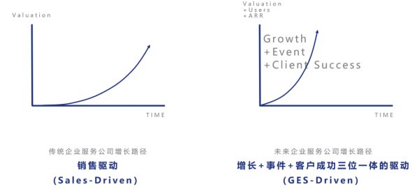 对比“销售驱动”和“GES三位一体驱动”模式:前者更多是“跪着赚钱”,或者最多技术特别厉害、能够“站着赚钱”;而未来企业服务公司通过新的增长模式,有可能站着、甚至“躺着赚钱”。