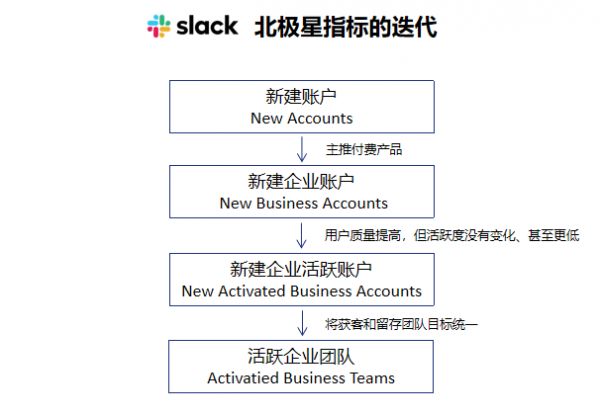 Slack的北极星指标也经历了几次迭代。Slack最早的北极星指标是“新建账户(New Account)”,此后开始主推付费产品,变更为“新建企业账户(New Business Accounts)”。6 个月之后,发现虽然这些用户的质量提高了,但其活跃度没有大的变化,有的时候还更低,于是又把北极星指标改成了“新建企业活跃账户(New Activated Business Accounts)”。再后来,将获客和留存团队目标统一,把“活跃企业团队(Activated Business Teams)”作为全新的北极星指标。