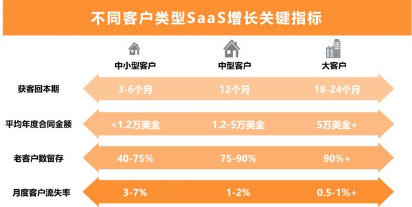此外,在成长期的企业服务公司,面对不同的客户类型,也有不同的增长关键指标。