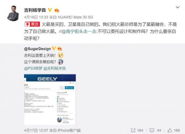 4月18日,吉利汽车集团副总裁杨学良在其微博上转发了上述招聘博文并回应称:“火箭是买的,卫星是自己做的。我们招火箭总师是为了星箭融合,不是为了自己做火箭。”吉利控股集团一名内部人士对记者表示,“招聘火箭总师主要为了对接卫星方面的业务,因为卫星要通过火箭来运送。”
