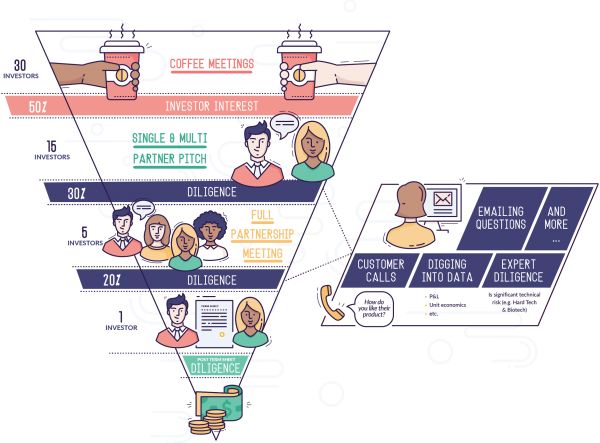 这个过程就像一个漏斗:每个阶段只有一部分投资者会通过。我们对融资成功的YC公司的流程进行过一些早期分析,找出了不断阶段的平均损耗水平[1]。平均而言,50%的咖啡会议的结果是单合伙人pitch, 30%的单个合伙人pitch推进到全体合伙人pitch,每5个全体合伙人pitch之后只有1个能拿到term sheet。请注意,这些数字是出自融资成功的部分公司——融资失败的公司数字可能要低得多。