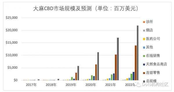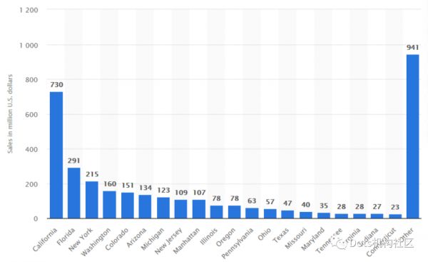 根据Statistica 2019年11月初的预测,2019年美国CBD市场规模34.7亿美元,低于Brightfield Group的预测。从这里我们也可以看出,得加州者得美国市场,加州占美国市场的21%, 紧随其后的是佛罗里达、纽约、华盛顿和科罗拉多。2019年美国CBD销售额低于此前预期的重要原因是,FDA 对CBD产业并没有采取热切的态度,而始终把CBD定义为药物,而不是作为膳食补充剂,因此也不能添加到食品饮料中。
