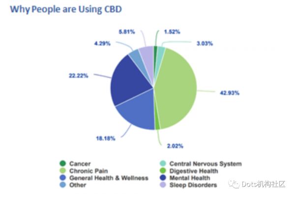 另据市场研究机构ValidCare 去年12月提交给FDA的一项抽样调查表明,并未发现任何CBD有损健康的情况。这项调查有2000多名美国人参加,年龄从19到82岁(平均48岁),男性占比44%。69%的被调查者服用全谱产品,不到10%使用纯CBD产品,50%每次服用10毫克CBD, 每天服用25-30毫克。70%的被调查者认为CBD有积极效果,20%表示CBD达到了意想不到的积极效果(例如缓解疼痛、改善情绪和睡眠等),只有5%表示存在咽喉痛、消化问题等副作用。43%的人因为慢性疼痛选择CBD, 22%因为精神性问题选择CBD (其中75%的人表示存在焦虑和压力问题), 18%因为一般性健康问题选择CBD, 其他使用理由包括解决中央神经系统、消化、睡眠障碍、癌症等方面的问题。