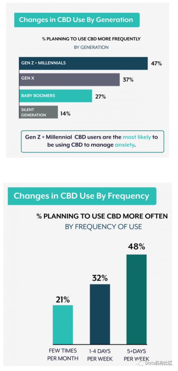 而在新冠疫情严重影响经济的今天,美国消费者对CBD的需求反而在上升,这也许是因为消费者更加青睐CBD在精神领域疗效的缘故。根据Brightfield Group的调查,越是年轻的消费者越倾向于增加CBD消费,Z世代和千禧一代的消费者中有47%计划增加CBD消费,且越是重度消费者越倾向于增加消费。而即便是家庭年收入低于4万美元的消费者,也有38%计划增加CBD消费。