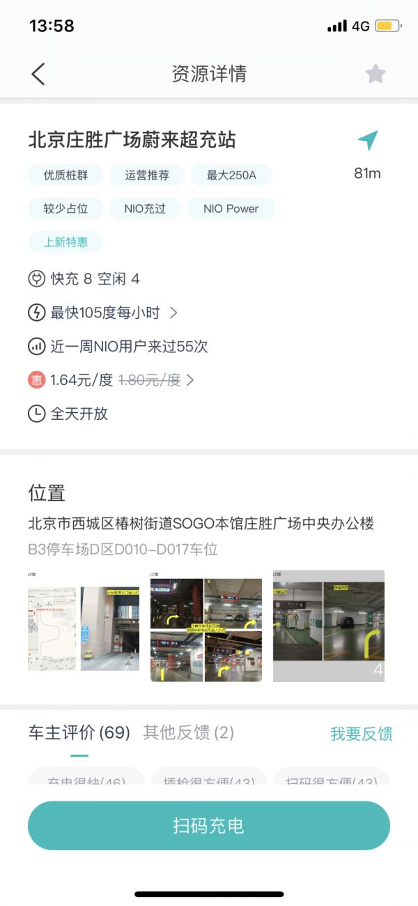 蔚来在北京的首座超级充电站位于宣武门外大街6号庄胜广场,在天安门西南方向大概3分钟的车程,算是非常核心的位置了,而且身处商场地库,周边配套设施也非常齐全。