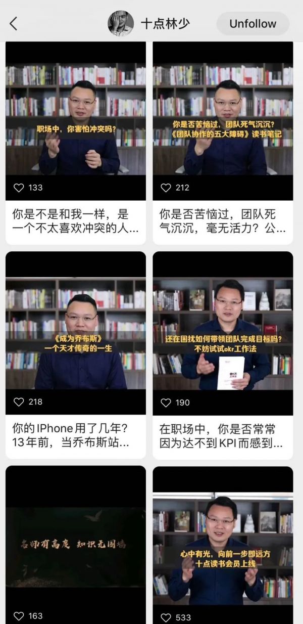 十点读书创始人林少说:“自媒体行业有很多老互联网人、科技达人,他们可能以前做公众号、做博客都不错,但抖音快手却没做起来,其实有很多原因,可能有些自媒体大叔本身就不适合那些平台的生态…但我们最近玩视频号都挺起劲的。”