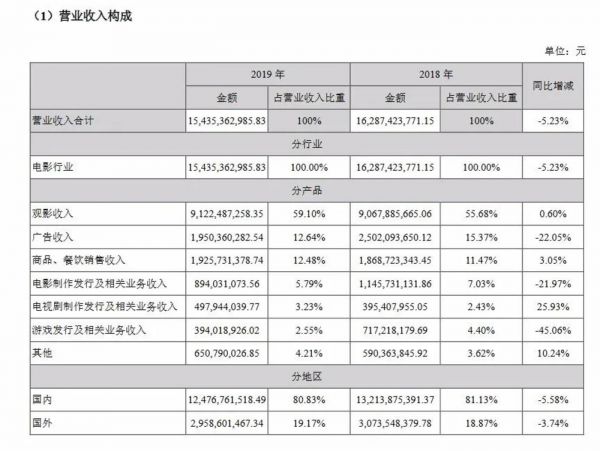 2019年,受宏观经济下行、电影市场增速整体放缓、影院竞争持续加剧和行业政策变化等因素影响,万达电影的经营业绩出现一定下滑。
