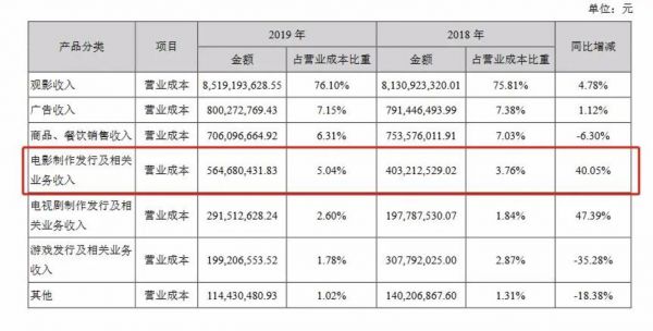 问题根源或许还是出在电影项目上。根据年报营业成本构成,电影制作发行业务营业成本较前一年增加40.05%,营业收入下降却高达21.97%。
