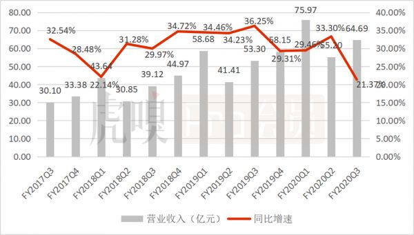 2020财年三季度(2019年12月1日至2020年2月29日),新东方实现营收64.69亿元,同比增速为21.37%,无论同比还是环比均处于放缓态势,创最近十个季度最低。