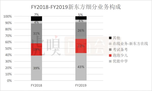 2019财年年报数据显示,新东方的K12业务收入占比65%,同比增加7个百分点,是公司最主要的营收源;其次是留学业务占比22%,同比增加3个百分点;而在线教育业务仅占4%,与2018财年数据持平。
