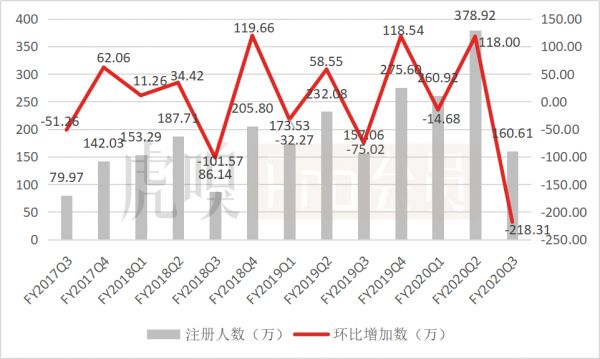 2017财年Q3、2018财年Q3和2019财年Q3的注册人数分别为79.97万、86.14万和157.06万,分别同比增加4.97万、6.17万和70.92万,逐年递增。而2020财年Q3的注册人数骤减至160.61,与去年同期基本持平,但环比减少218.31万,这直接导致新东方营收“减速”。
