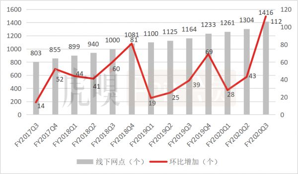 2020财年Q3,新东方依然延续了线下积极扩张的策略,线下网点达到了1416家,环比增加112个。