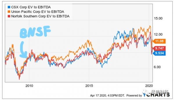 最后,当然,就资金配置而言,投资伯灵顿北方圣菲铁路公司的交易与其他任何交易相比都是一个巨大的亮点,这一点应该非常引人注目。它实际上相当于所有其他交易的总和。当时,他还因为这笔交易受到了很多批评,许多人认为他为铁路业务支付了过高的价格。以下是三个主要美国货运铁路公司(CSX Corp.,CSX)、联合太平洋公司(Union Pacific Corp.,UNP)和诺福克南方公司(Norfolk Southern Corp.,NSC)的EV/EBITDA倍数(企业价值倍数)。
