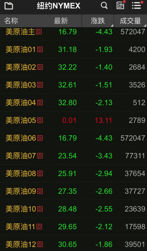 如上图,显示了美国纽约商品交易所上市的美国原油期货合约的全部价格。美原油05 - 12,代表的是原油2020年05月到2020年12月的价格,而美原油01 - 04,代表的是原油2021年01月到2021年04月的价格。很多人口中的原油暴跌,原油指的正是即将交割的美原油05。