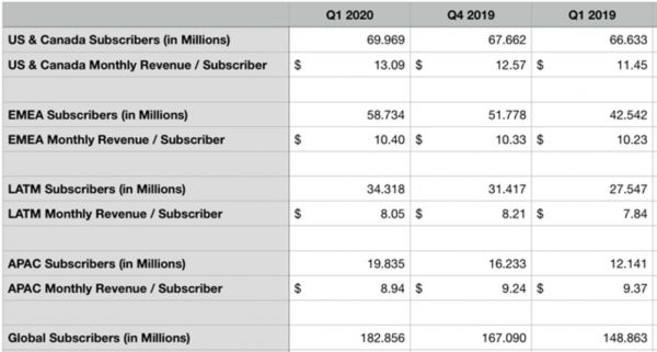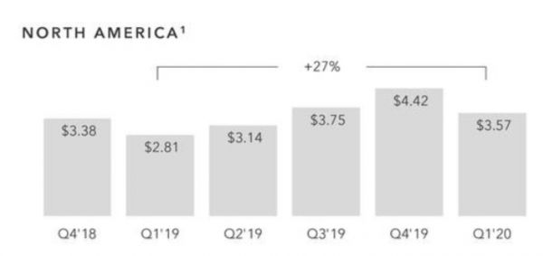 虽然我们现在知道,2020 年第一季度同比增长了 27%。但十分有必要警惕,从 2019 年第四季度到 2020 年第一季度,北美地区 ARPU 下降了约 19.2%。