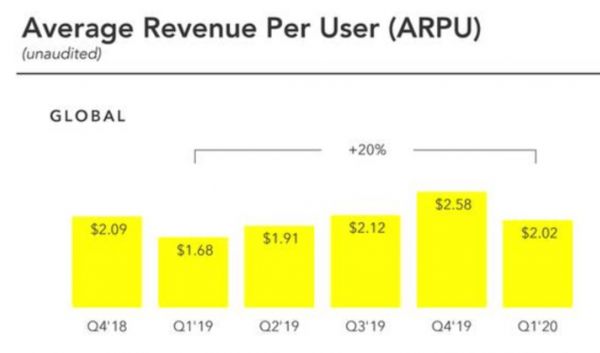 可以看到,从 2018 年第四季度到 2019 年第一季度,Snap 的 ARPU 下降了 16.9%。