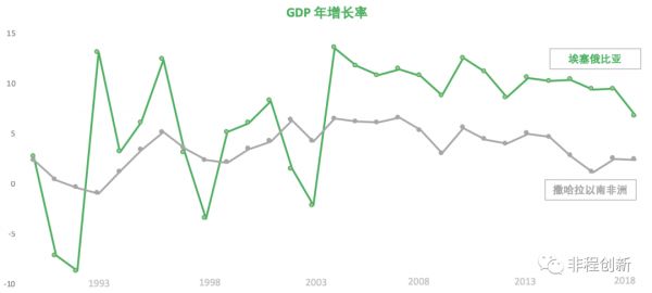 埃塞目前仍属低收入国家,人均 GDP 为770美元,低于撒哈拉以南非洲地区的平均水平1574美元,但自2000年来,经济增长趋势已远超邻国,成为非洲增长最快的经济体之一。据世界发展指标(World Development Indicator)显示,在2000年至2018年之间,埃塞俄比亚 GDP 年增长平均高达6.8%,按 GDP 总量体量来说,是非洲第七大经济体。在过去二十年中,埃塞俄比亚的经济增长主要受政府对基础设施投资的推动。农业转型、增长制造业和服务业也是近年来埃塞政府经济改革的重点目标。在其政府的第二个增长与转型五年规划中,计划到2025年,成为低中等收入国家。