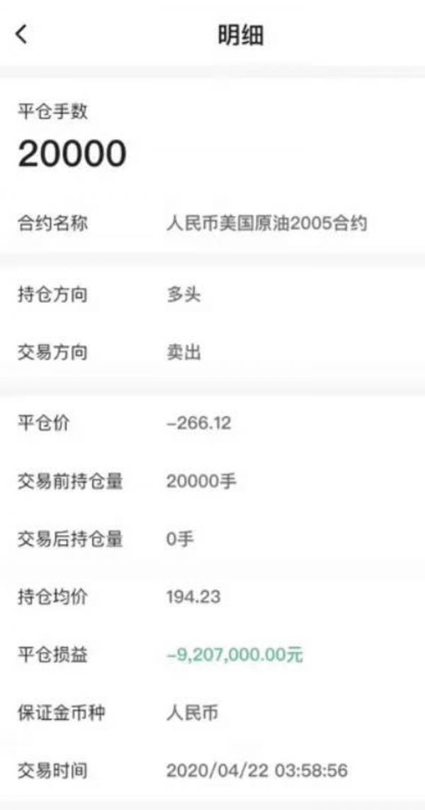 网络流传的一张客户结算单显示,中国银行向该投资者发送的结算价格是-266.12元,投资者开仓本金是194.23元,本金388.46万元,但是经过原油负值以后现在总体亏损920.7万元,倒欠银行532.24万元。