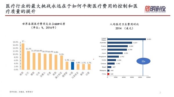 但是你也可以看到,另外一个角度来讲,尤其是前几年,很多中国患者会到美国去看病,为什么?大家认定美国的治疗效果是最好的。中国的GDP表现越来越好,大家也会期待更有质量的医疗。怎么平衡这个事情?我们投资人有什么好的方案能够让我们这个行业既提高质量,又控制费用,我们看很多投资项目的时候,第一个思考的就是这个项目能解决什么问题?是解决医疗质量问题还是费用问题?这是医疗投资里面最大的一个主题。