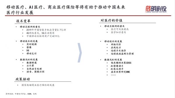 技术变革下的医疗行业趋势是什么?启明创投主管合伙人胡旭波认为,医疗行业平衡控制费用和提升质量之间关系的主题将基本不变,医疗人工智能、移动医疗等领域的发展,将有助于推动中国医疗行业的进一步发展。