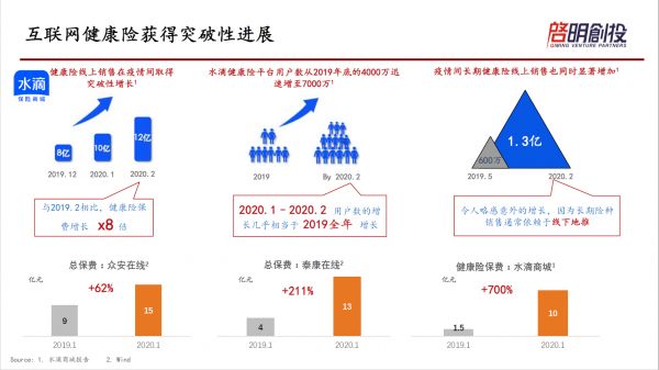 结合互联网替代、平台效应以后,互联网健康平台的发展加速。据水滴的公开数据,它的交易量增长非常快,从2019年的1月到2020年1月,同期已经增长700%以上。