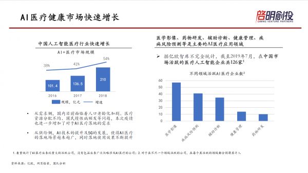 AI本身的学习能力,能够很快培养起自己的诊断能力。只要数据量足够大,机器可以24小时工作,成本也很低。它扫一下就可以了出一张报告,比较而言,增加医生的成本高得多。所以这一块应该是最天然能够结合的,也是最容易出成果的,当然,壁垒也相对低一点,竞争会很激烈。