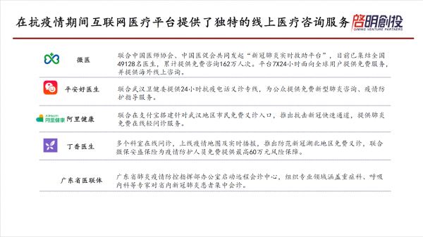 讲到疫情,抗疫期间整个互联网医疗平台提供了非常独特的线上诊疗服务,我列了一些,包括微医、平安好医生、阿里健康等等,包括公立医院里面的医联体等等都在提供这样的服务,我们看到都发挥了很好的作用。