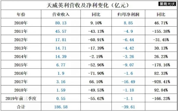 比如天威英利营业收入已经从2010年的80.13亿元降至2018年的1.59亿元,降幅98.02%,2019年前三季度营业收入再度同比下降了55.62%,仅为0.55亿元。其归母净利润更是至少连续8年(2011-2018年)亏损,2019年前三季度继续亏损1.1亿元,同比下降了166.23%。