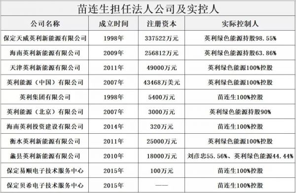 据黑鹰光伏统计,目前苗连生至少还担任11家公司法人、董事长、总经理等职务。其中4家为苗连生全资控股公司,分别为英利集团有限公司、海南英利投资建设有限公司、保定易顺电子技术服务中心和保定贝希电子技术服务中心,其余均为英利控股或参股公司。