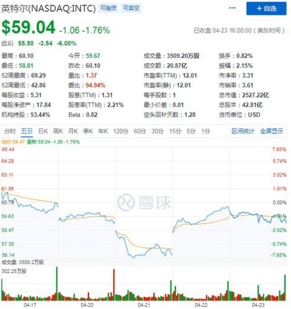 在财报发布后,截止文章发稿,目前英特尔盘后股价为55.50美元,盘后股价下跌6.00%,市值为2527.22亿美元。